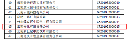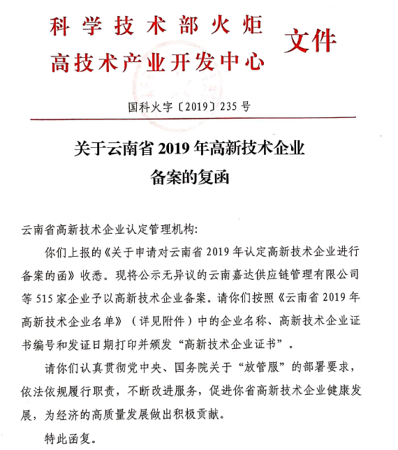 根據(jù)全國高新技術(shù)企業(yè)認定管理工作領導小組辦公室《關于云南省2019年高新技術(shù)企業(yè)備案的復函》(國科火字﹝2019﹞235號),公司再次獲得“高新技術(shù)企業(yè)”稱號。