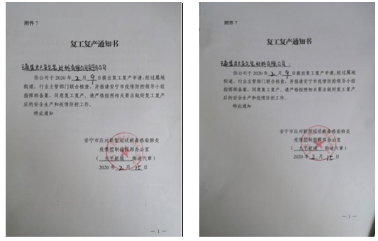 2月3日:1.安寧市工信局對福保祥瑞公司作準予復工復產(chǎn)批復,感到高興;2.安化社區(qū)借旭潤公司1支紅外線測溫儀使用。