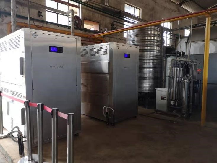 蒸汽熱源機組由2臺蒸發(fā)量為1t/h的蒸汽熱源機組成,具有自動化程度高、熱效率高、供汽速度快、設備操作簡單、占地面積較小等特點,不僅改善了現(xiàn)場作業(yè)環(huán)境,有效解決了環(huán)保、職業(yè)衛(wèi)生等問題,還實現(xiàn)了自動化、無人化生產(chǎn),滿足安全技術發(fā)展目標要求。目前該設備已投入使用,運行期間各設備運行平穩(wěn),產(chǎn)生的蒸汽壓力約0.6Mpa,到達用汽點的蒸汽壓力約0.4 Mpa左右,能夠滿足生產(chǎn)線用汽需求。