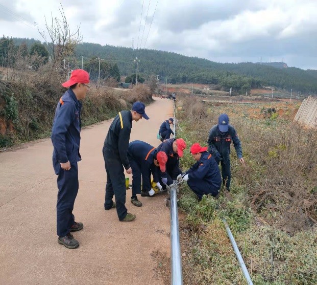因事關(guān)村民生活保障,分公司領導幾次組織人員親臨現(xiàn)場,與村民負責人進行溝通協(xié)商,不斷改進施工方案。由于擔心管道改造影響生產(chǎn)生活供水,改造方案確定后,施工必須在兩天內(nèi)完成。時間緊、任務重,在做好準備工作后,玉溪分公司現(xiàn)場施工人員利用停產(chǎn)間隙,于1月25日清晨,迎著刺骨的寒風開始作業(yè)。在現(xiàn)場負責人的指揮下,開挖過路預埋溝渠、排布、固定、組焊、回填等流程皆按預定程序有序推進。