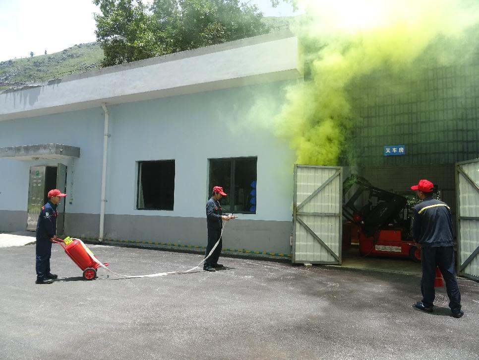 下午14時,叉車充電突發(fā)“火災”,應急演練正式開始。演練假設叉車在充電過程中電瓶起火,煙霧迅速彌漫。充電站旁的修理工房人員發(fā)現(xiàn)火情后,立即向車間控制室和公司領(lǐng)導報告。接到報警后,公司迅速啟動滅火救援應急處置預案,搶險救援人員立即攜帶現(xiàn)場配備的手推式干粉滅火器和手提式干粉滅火器趕赴現(xiàn)場進行滅火,經(jīng)過5分鐘的緊急救援,叉車火情得到有效控制。