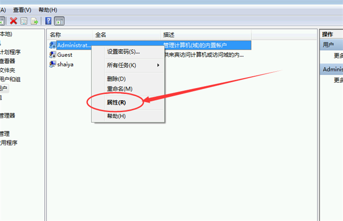 3、在右側(cè)的分組框內(nèi)選中超級(jí)管理員用戶(默認(rèn)是Admonistrator,若操作系統(tǒng)使win7以上則選擇你自己設(shè)置的用戶),點(diǎn)擊鼠標(biāo)右鍵,并點(diǎn)擊“屬性”按鈕;