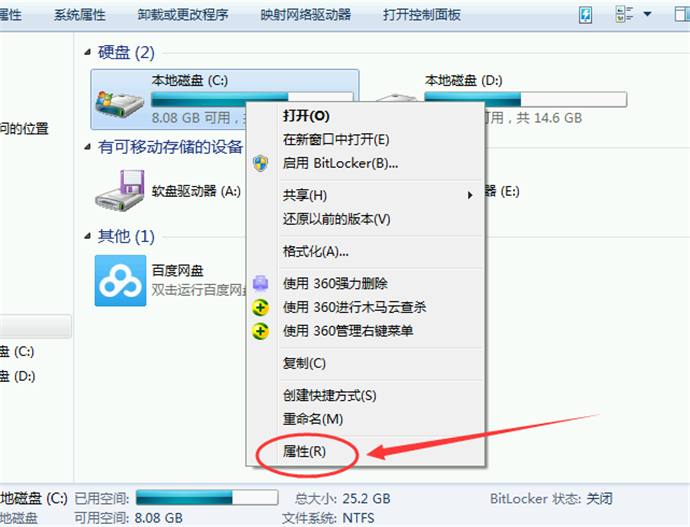 1、鼠標(biāo)右鍵點(diǎn)擊C盤,在彈出的菜單中選擇“屬性”按鈕;