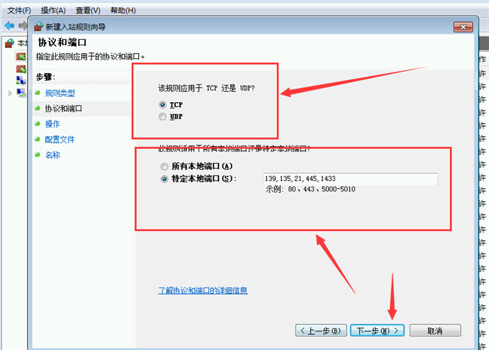 8、在右側(cè)的選擇夾中選中“TCP”單選框,并編輯框內(nèi)輸入要封閉的端口號(hào):139,135,21,445,1433,3389。點(diǎn)擊“下一步”注:端口相當(dāng)于操作系統(tǒng)的門,windows操作系統(tǒng)共計(jì)65535個(gè)端口。常被黑客利用的端口有:139、135、21、445、1433、3389。