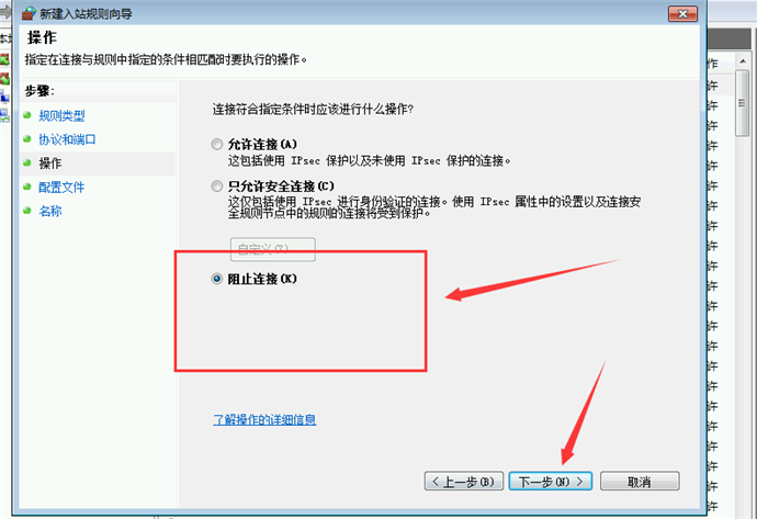 9、選中“阻止鏈接”單選框后,點(diǎn)擊“下一步”